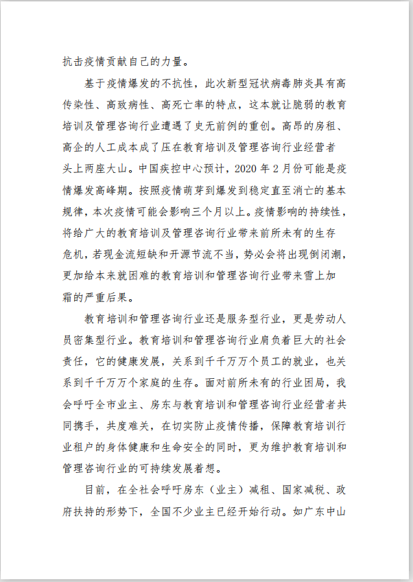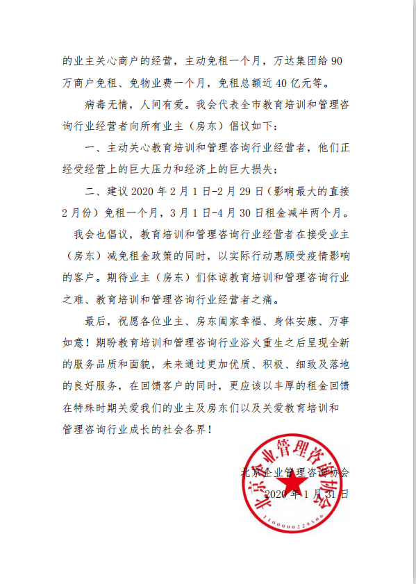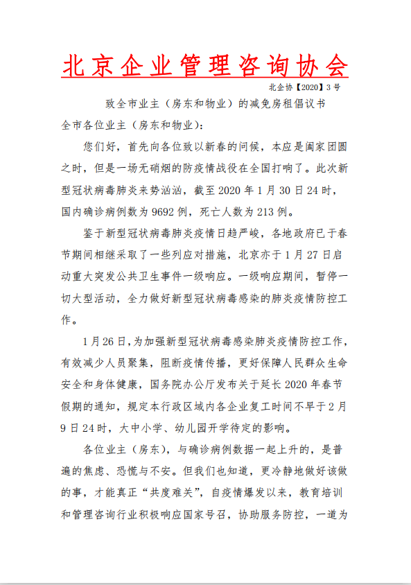 1月31日,北京企業(yè)管理咨詢協(xié)會發(fā)布《致全市業(yè)主(房東和物業(yè))的減租倡議書》,《倡議書》稱,協(xié)會代表全市所有住房租賃行業(yè)經(jīng)營業(yè)主向房東和物業(yè)號召主動減租。倡議書稱,此次疫情給住房租賃行業(yè)經(jīng)營者帶來了前所未有的生存危機,面對前所未有的行業(yè)困局,我會呼吁全市業(yè)主、房東與教育培訓(xùn)和管理咨詢行業(yè)經(jīng)營者共同攜手,共度難關(guān),在切實防止疫情傳播,保障教育培訓(xùn)行業(yè)租戶的身體健康和生命安全的同時,更為維護教育培訓(xùn)和管理咨詢行業(yè)的可持續(xù)發(fā)展著想。目前,在全社會呼吁房東(業(yè)主)減租、國家減稅、政府扶持的形勢下,全國不少業(yè)主已經(jīng)開始行動。為此,號召房東在未來三個月對業(yè)主進行減租。教育培訓(xùn)和管理咨詢行業(yè)經(jīng)營者在接受業(yè)主(房東)減免租金政策的同時,以實際行動惠顧受疫情影響的客戶。期待業(yè)主(房東)們體諒教育培訓(xùn)和管理咨詢行業(yè)之難、教育培訓(xùn)和管理咨詢行業(yè)經(jīng)營者之痛。